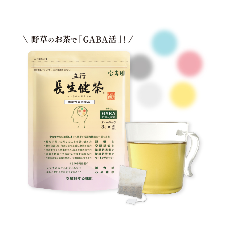 五行 長生健茶には1日分(ティーバッグ1個)につき、GABAが200mg含まれていて、そのGABAが中高年の加齢によって低下する認知機能の一部である記憶力、空間認知力、論理的思考力、持続的注意力、ワーキングメモリーおよび中高年の活力感、心の健康を維持する機能があることが報告されているそうです。