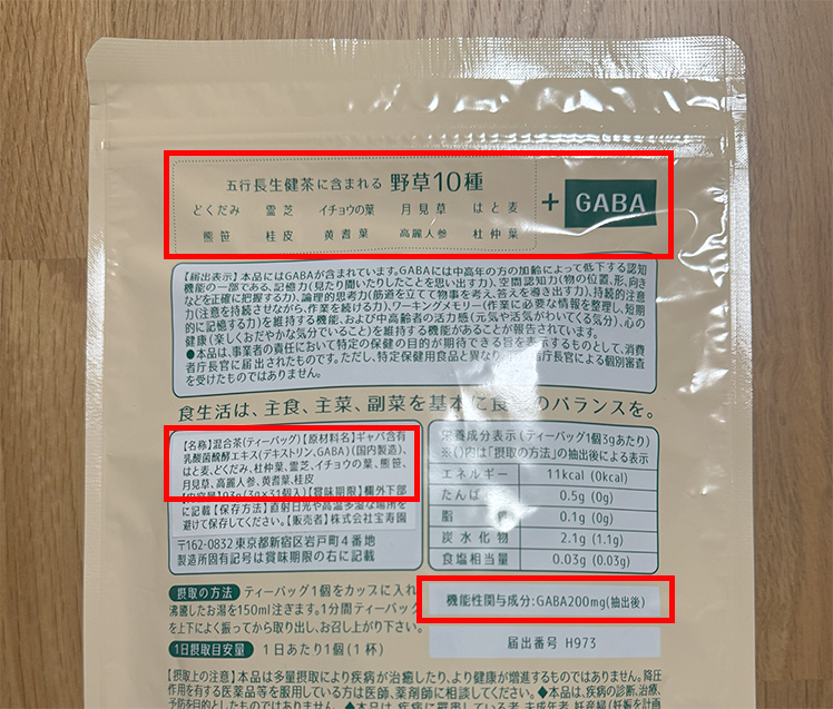 商品の裏には入っている原材料が表示されていて、10種類の野草とGABAだけで他には何も入って無いようです。「機能性関与成分:GABA200mg(抽出後)」と書かれていて、これが認知機能維持対策の成分のようですね。