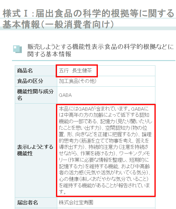 機能性関与成分はGABAで、「表示しようとする機能性」のところに具体的な内容が書かれていました。機能性表示食品とはそういう仕組みで、五行 長生健茶は消費者庁に届け出ている商品だということが確認できました。